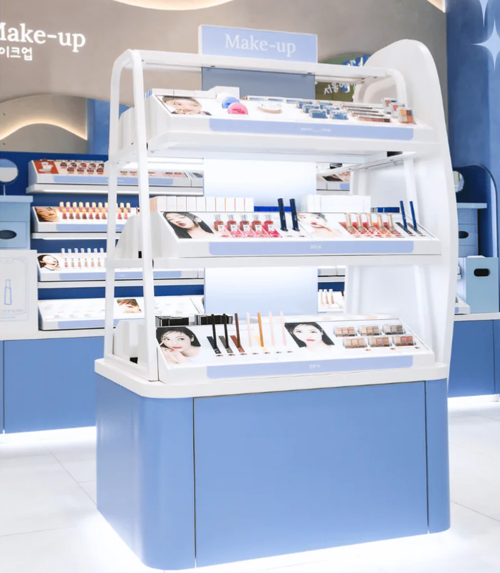 Freestanding Make-Up gondolas with LED-integrated shelving and sleek forms