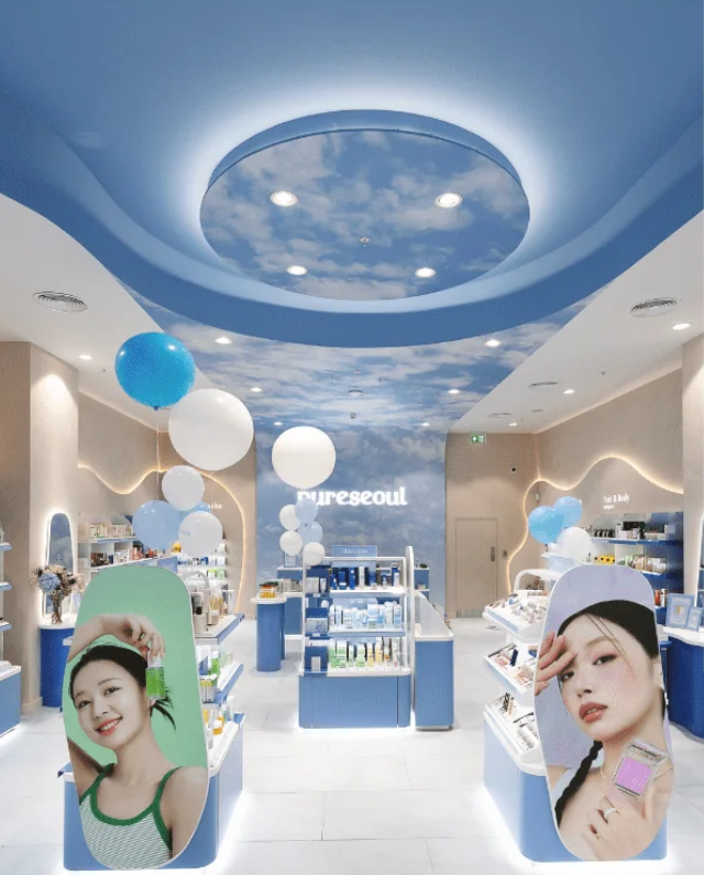 The ceiling mural and ambient lighting combine with the radius fixtures create a clean, ethereal atmosphere—echoing the "cloud-like" purity that pureseoul celebrates.
